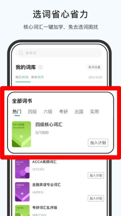 4、进入词书页面可按热门、考试等级等分类快速添加目标词书到学习计划中。