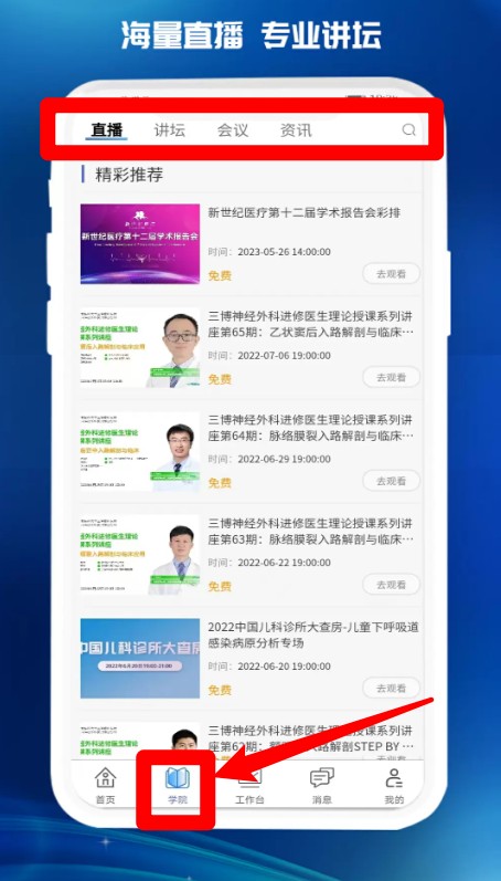 2.点击“学院”板块可查看直播、讲坛、会议及医学资讯,适合医生学术学习与知识更新。