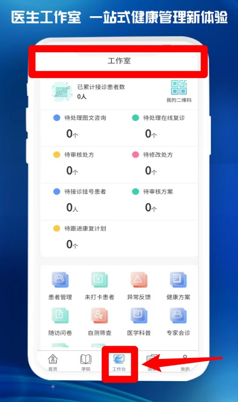3.“工作台”提供医生专属工作室,支持患者管理、处方处理、健康方案制定等多种功能。
