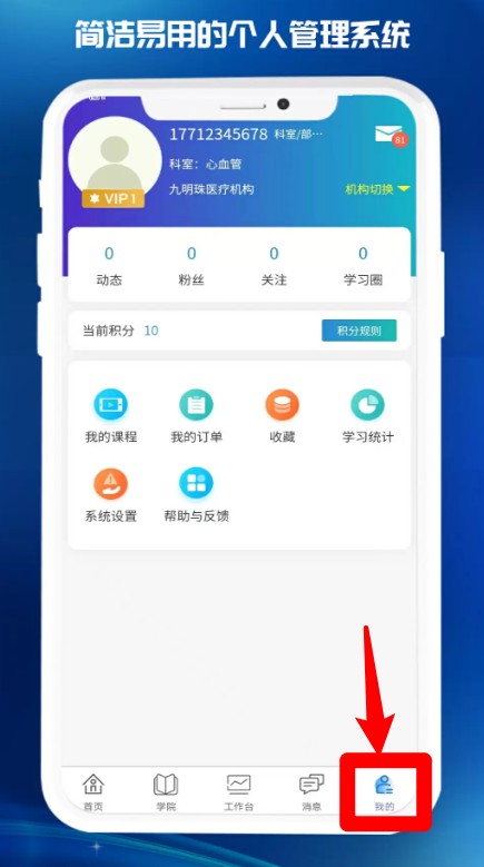 5.点击“我的”可进入个人中心,查看课程、订单、收藏及积分信息,支持账号个性化设置。