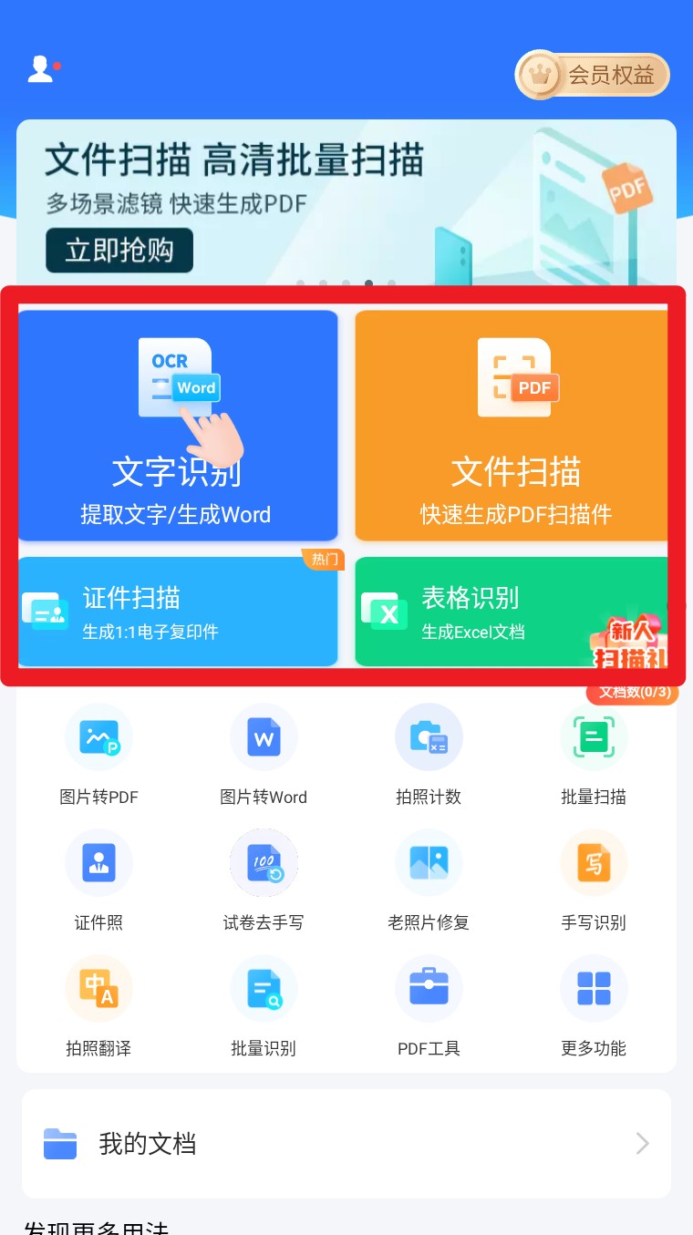 1. 打开App进入首页,点击“文字识别”或“文件扫描”模块,进入对应功能的操作入口。