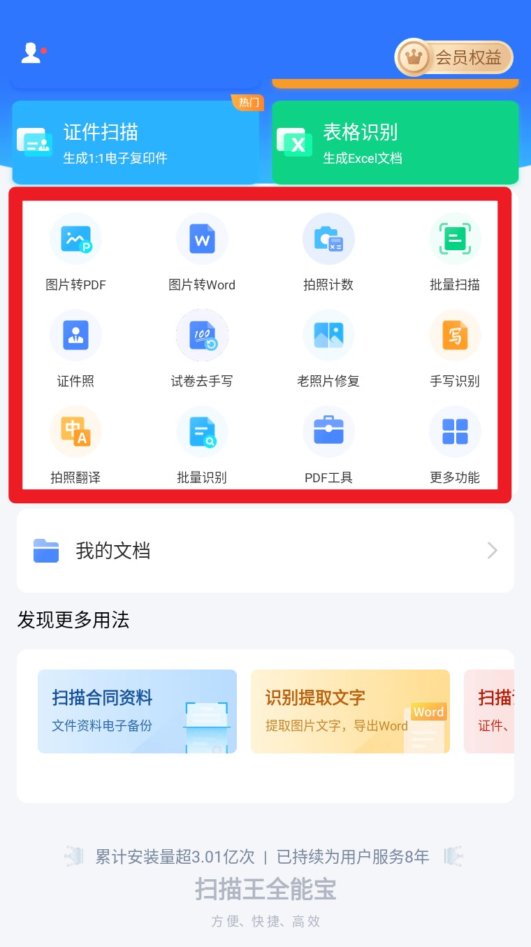 2. 在功能列表中可选择不同识别类型,如证件照、拍照翻译、表格识别等,点击进入对应模块。