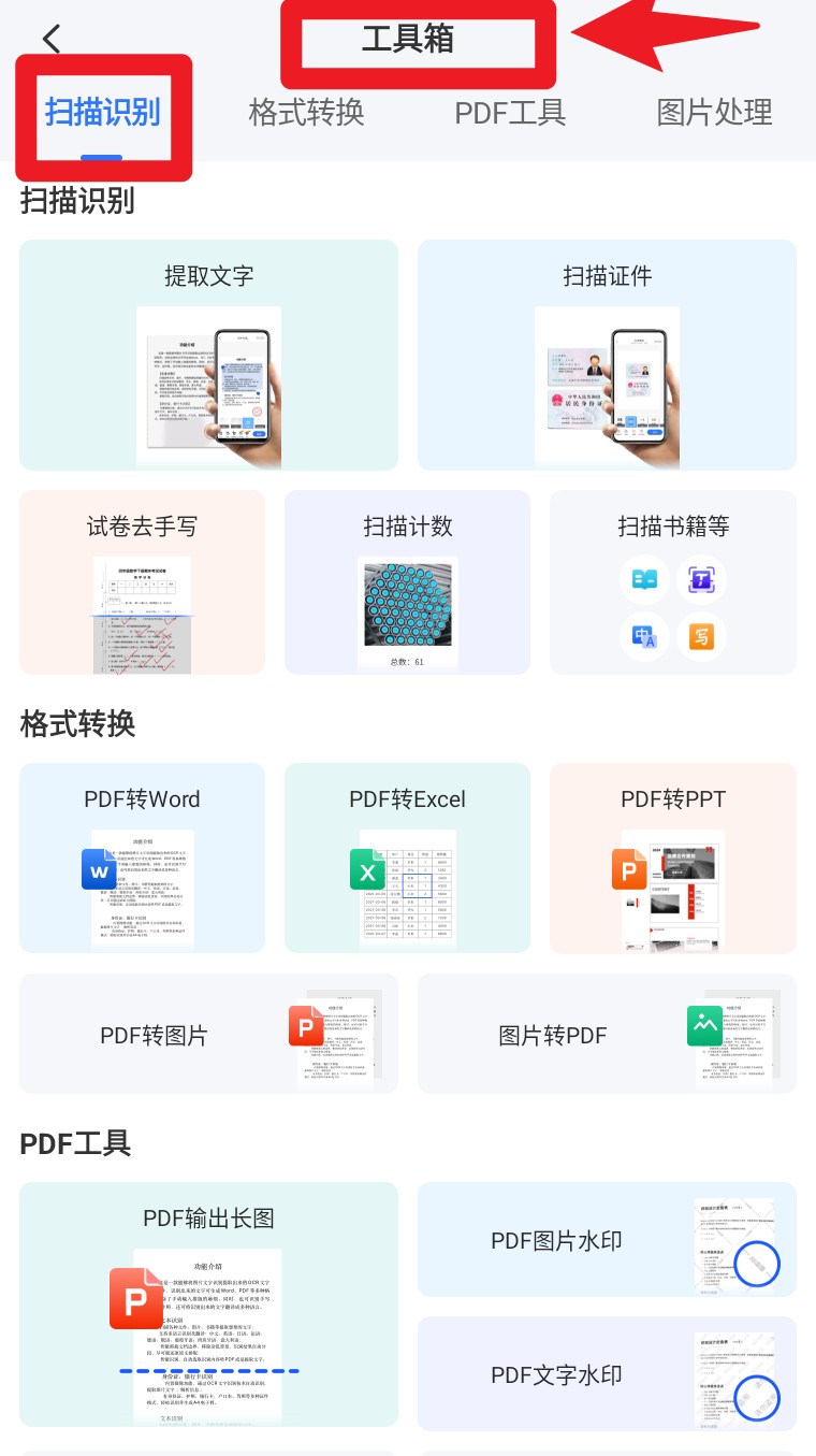 3. 点击底部“工具箱”标签,在“扫描识别”中可查看提取文字、证件扫描、试卷识别等功能。
