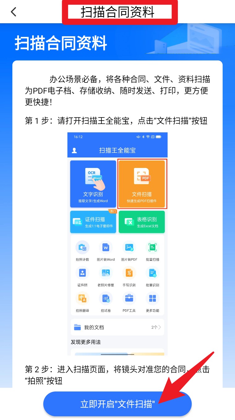 5. 若需扫描合同资料,可点击首页“文件扫描”,按提示拍摄后即可生成清晰PDF电子档。