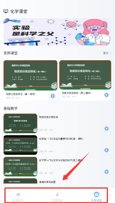3、成功登录后点击底部导航栏,即可浏览各类化学实验教程、元素资料等专业内容进行学习。