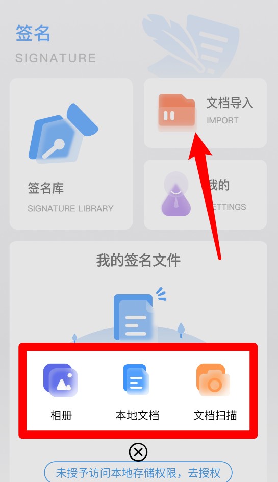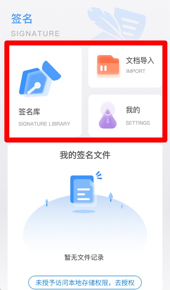 1、首页提供“签名库”“文档导入”和“我的”等模块,可快速进入签名操作和设置页面。