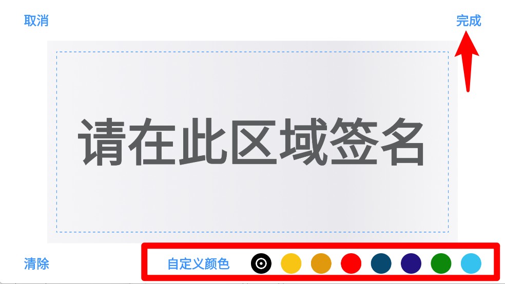 2、点击签名区域可手写签名,并自定义颜色,完成后点击右上角“完成”保存签名图像。
