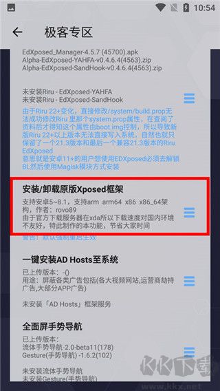 2、在极客专区中向下滑动,找到 “安装 / 卸载原版 xposed 框架” 选项,点击进入。