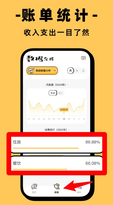 4、账单统计模块提供支出占比图表,帮助用户掌握住房、餐饮等各类消费比例,优化消费结构。