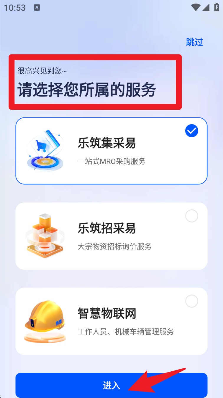 1. 打开乐筑 App,首次进入时选择所需服务模块,如“集采易”“招采易”或“智慧物联网”。