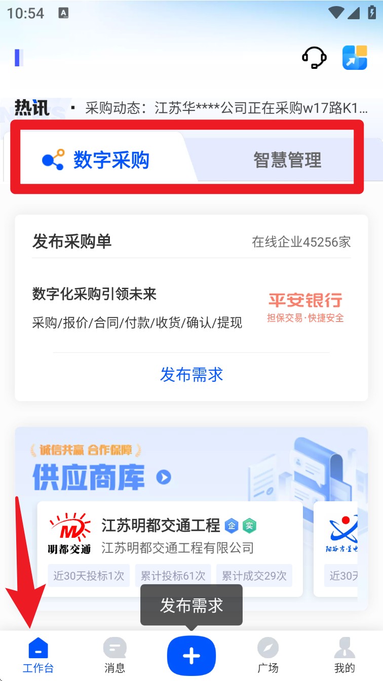 3. 登录成功后,进入首页“工作台”页面,可切换数字采购或智慧管理等功能模块。