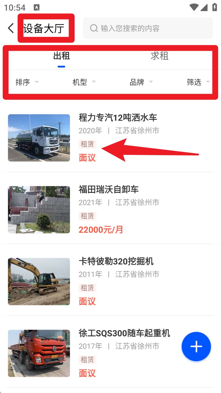5. 在“设备大厅”中选择“出租”或“求租”,支持筛选车型、品牌、价格等详细条件。