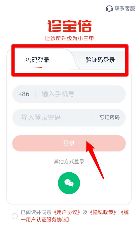 1、打开诊宝倍App,选择密码登录或验证码登录方式,输入手机号和信息后点击按钮完成登录。