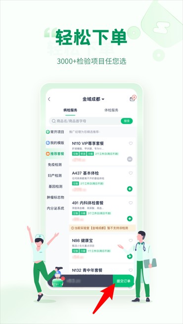2、登录后可浏览各类体检套餐,支持筛选体检项目并直接点击“提交订单”快速完成下单操作。