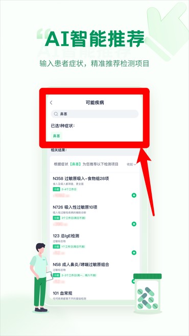 4、通过AI智能推荐功能输入症状系统自动匹配相关检测项目,提升检查效率与准确性。