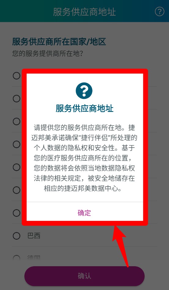 2.登录成功后将弹出服务供应商说明,需选择所在国家并阅读提示,点击“确定”后方可继续操作。