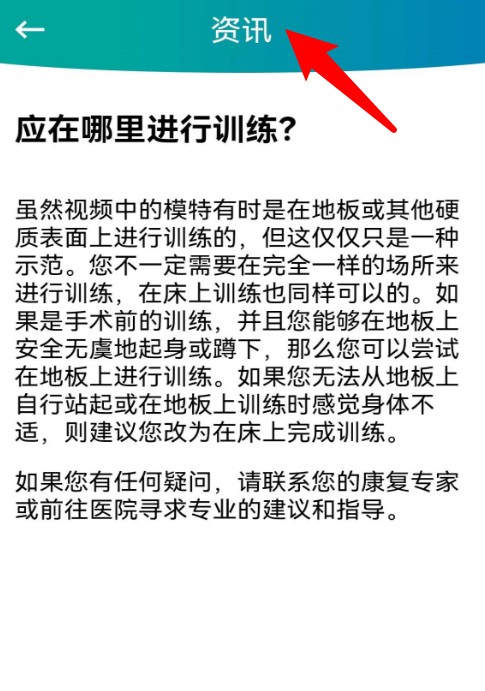 3.在“资讯”栏目中可阅读康复训练的注意事项与建议,帮助用户了解各项训练的正确场地与方式。