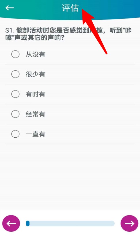 4.在“评估”模块中,通过选择问卷选项记录关节情况,系统将根据反馈评估用户的术后恢复状况。