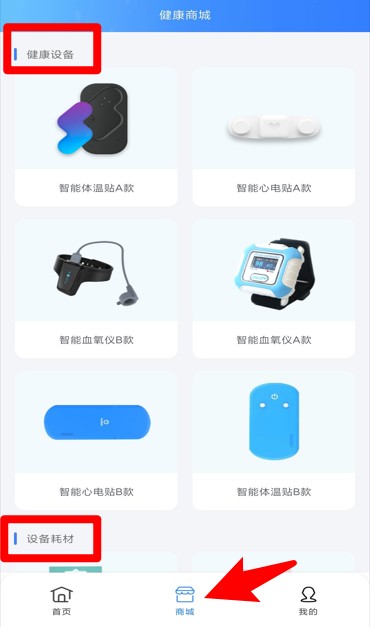 2.登录成功后点击底部导航栏中的“商城”按钮,即可浏览各类健康设备与配件的分类页面。