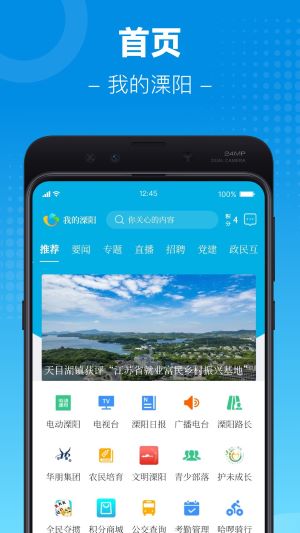 1、打开“我的溧阳”APP,首页默认显示推荐内容及快捷功能图标,航栏上方可选择“要闻”“直播”“政务互动”等。