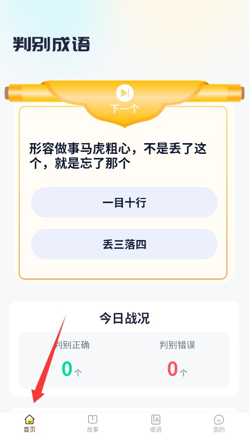 1、打开胸有成语APP,可在首页选择成语识别功能,通过题目选择正确的成语进行学习。