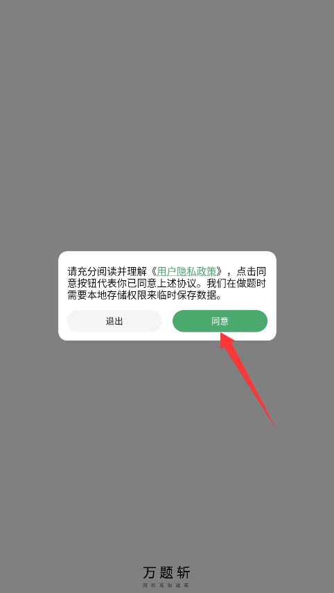 1、初次启动万题斩APP时,系统会显示用户隐私政策,仔细阅读后点击同意按钮进入。