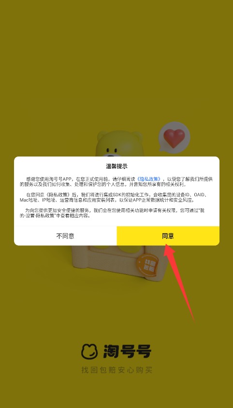 1、首次运行淘号号APP时,请仔细阅读用户协议与隐私政策,确认无误后点击同意进入主界面。