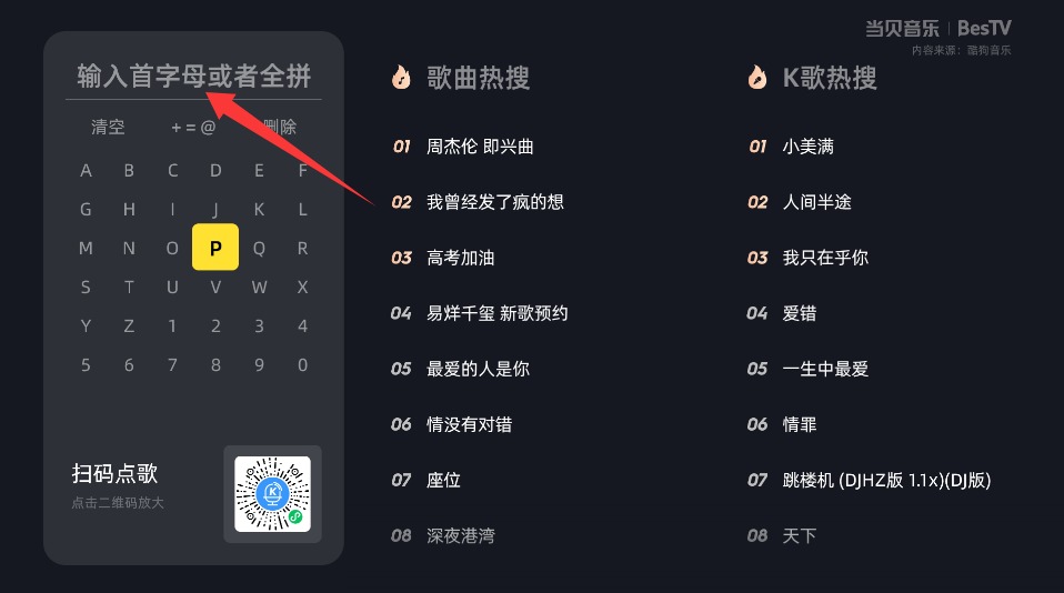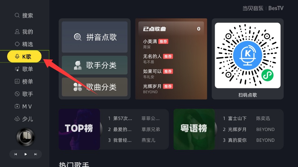 1、打开当贝音乐需点击左侧功能栏选择K歌模式,进入专属歌唱界面准备点歌。