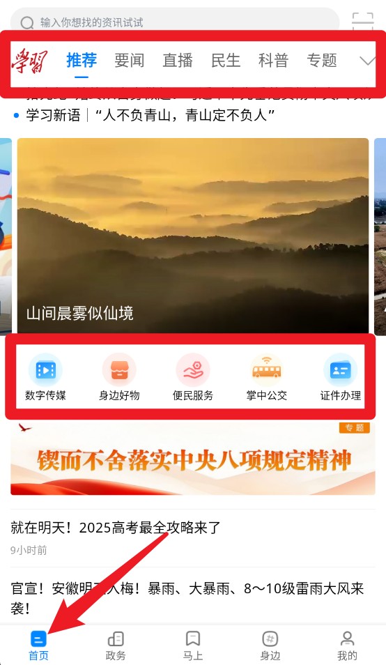 1.首页聚合推荐、热点、便民服务等内容模块,提供数字传媒、公交出行、证件办理等便捷入口。