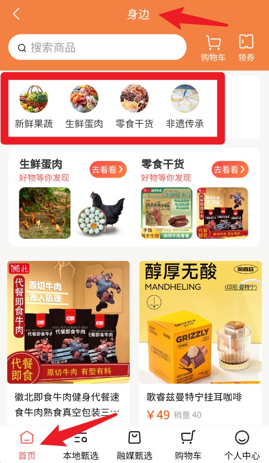 4.身边页面整合本地电商服务,分类提供生鲜果蔬、蛋肉干货等商品资源,支持在线购物功能。