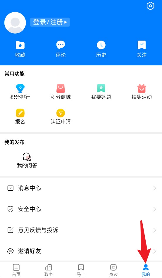 5.我的页面提供个人中心功能,可进行登录注册、积分兑换、认证申请及反馈建议操作管理。