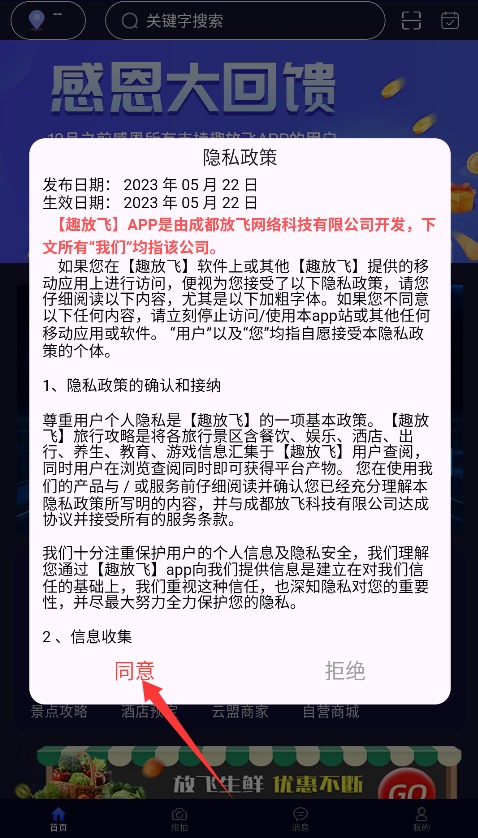 1、首次使用趣放飞APP时,系统会显示用户隐私政策,仔细阅读后点击同意按钮进入。