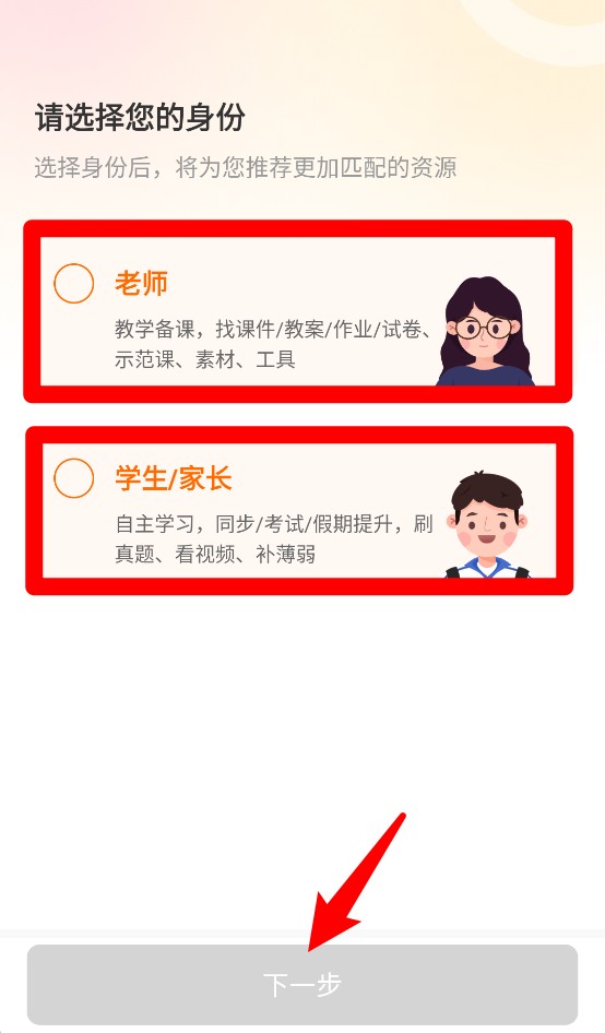 1、首次进入应用需选择“老师”或“学生/家长”身份,以便平台精准推荐所需学习与教学资源。