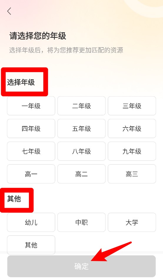 2、根据实际年级选择对应选项,支持小学到高中及幼儿、大学、中职等不同阶段内容。