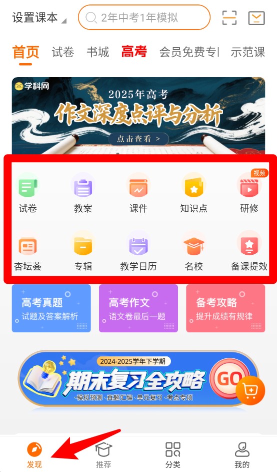 3、在“发现”页可快速进入试卷、教案、课件等分类资源,帮助用户高效获取所需资料。