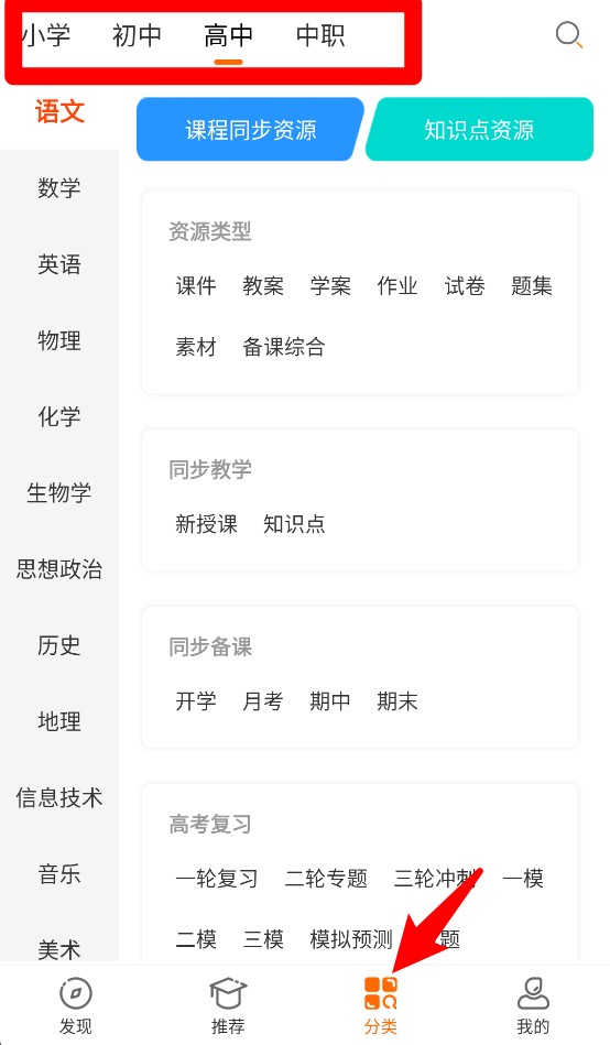 5、分类板块中按学段、学科和资源类型整理教学内容,方便精准查找课程、题库与素材。
