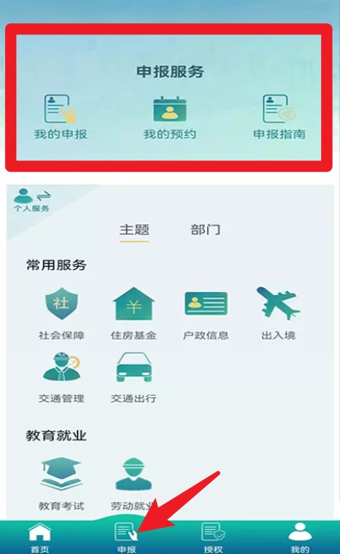 2、“申报”页面提供我的申报、预约及申报指南,便于用户查看申报记录与办理进度。