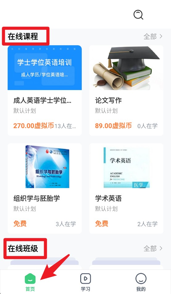 2、首页展示“在线课程”与“在线班级”两大板块,用户可快速查看当前开放课程及班级内容。