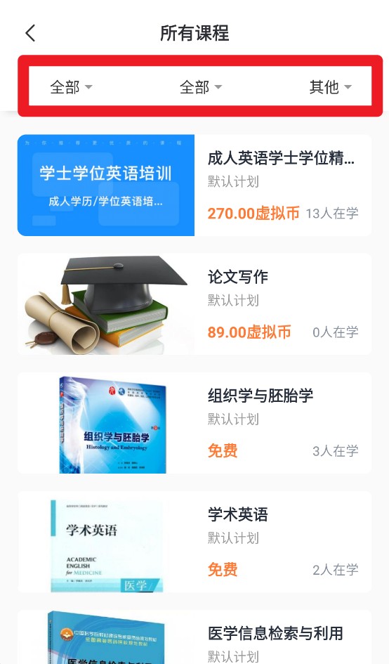 3、“所有课程”页面设有多条件筛选栏,用户可按不同维度查找所需课程,提升查找效率。