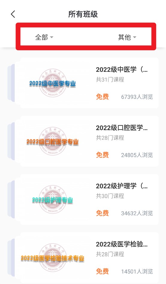 4、“所有班级”页面支持多维度筛选,展示不同专业班级及课程数量、浏览人数等详细信息。