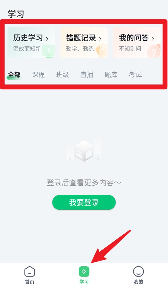 5、“学习”页面集合历史学习、错题记录、我的问答等模块,并需登录后方可解锁完整功能内容。