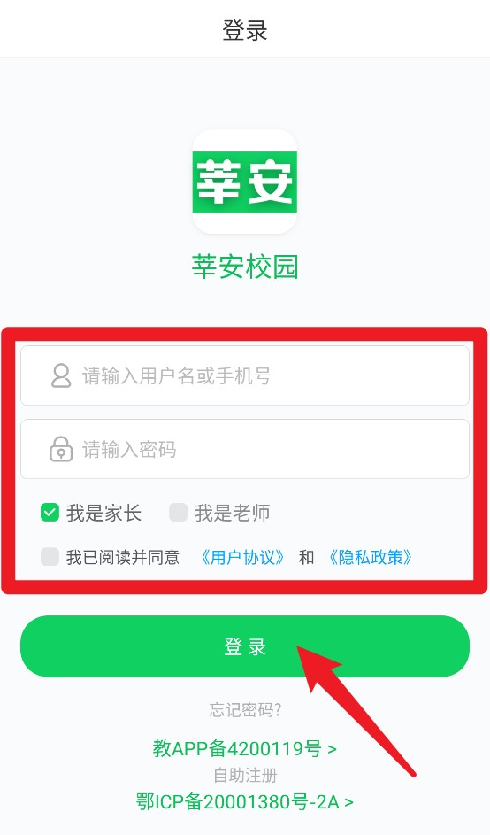 1、登录界面可选择家长或老师身份,输入用户名和密码后勾选协议并点击登录按钮。