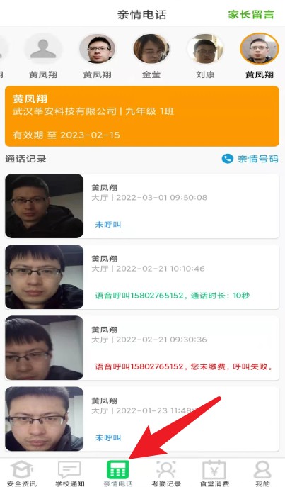 4、亲情电话功能记录与学生的语音通话情况,可查看通话时间、时长与通话状态。