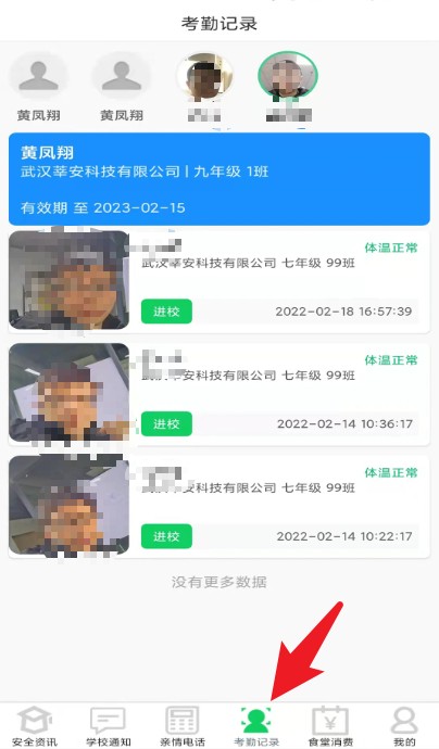 5、考勤记录页面显示学生进校与体温状态信息,帮助家长及时掌握孩子到校情况。