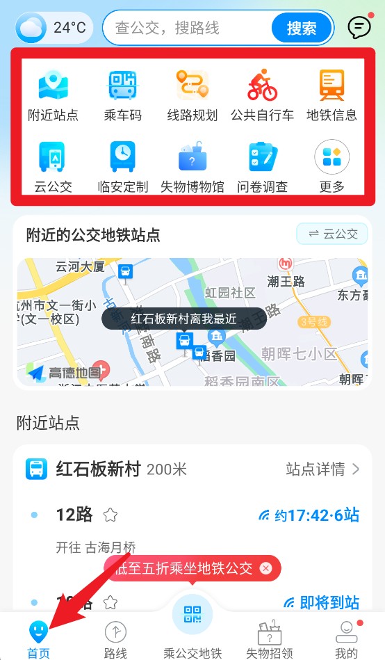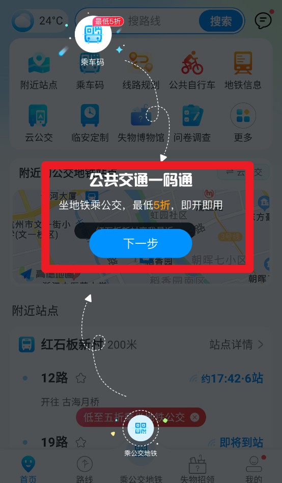 1、首页功能区提供附近站点、乘车码、路线规划、自行车及地铁信息,方便快速查找与出行。
