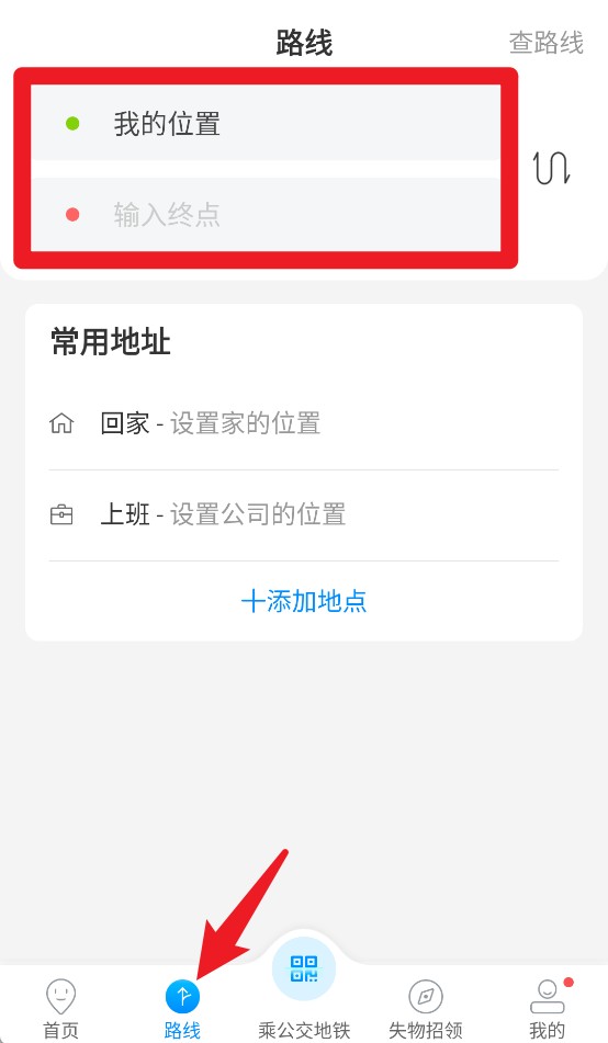 4、路线页面可设定起点终点,并添加常用地址如“家”与“公司”,便于快速规划通勤路线。