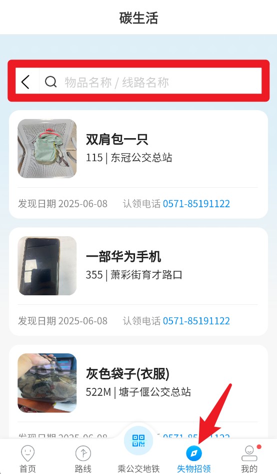 5、失物招领页面可按物品或线路名称搜索,查看失物照片、站点及联系电话,助力快速找回。