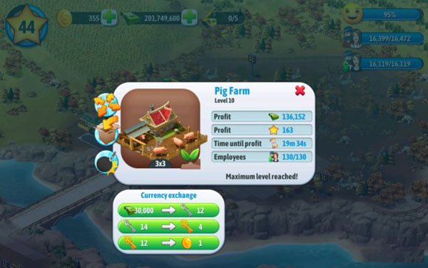 4、有时间时多建造耗时短,升级快的建筑,没时间多建造时间长利润高的,我用金钥匙兑换了一个巨坑5×5水上乐园,占地方,利润少,当然也有多的;