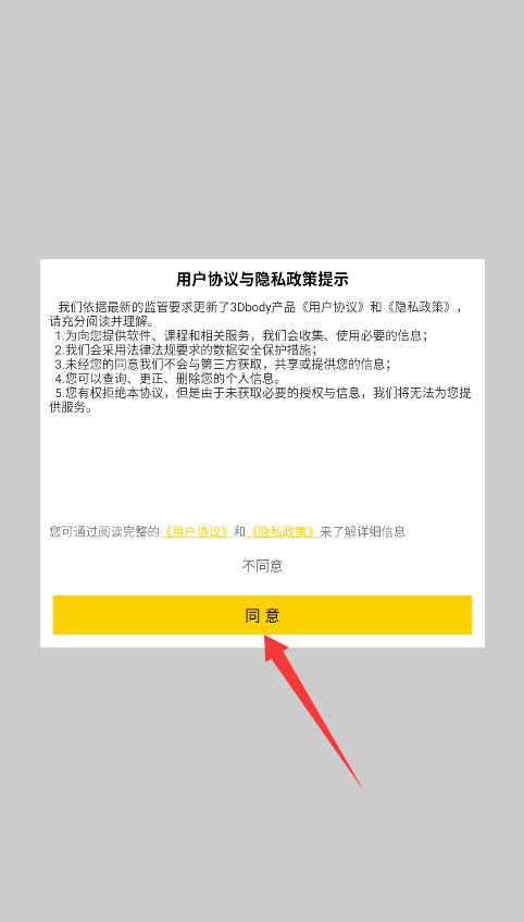 1、首次使用3DBodyAPP需仔细阅读用户协议与隐私政策,点击同意按钮进入登录页面。