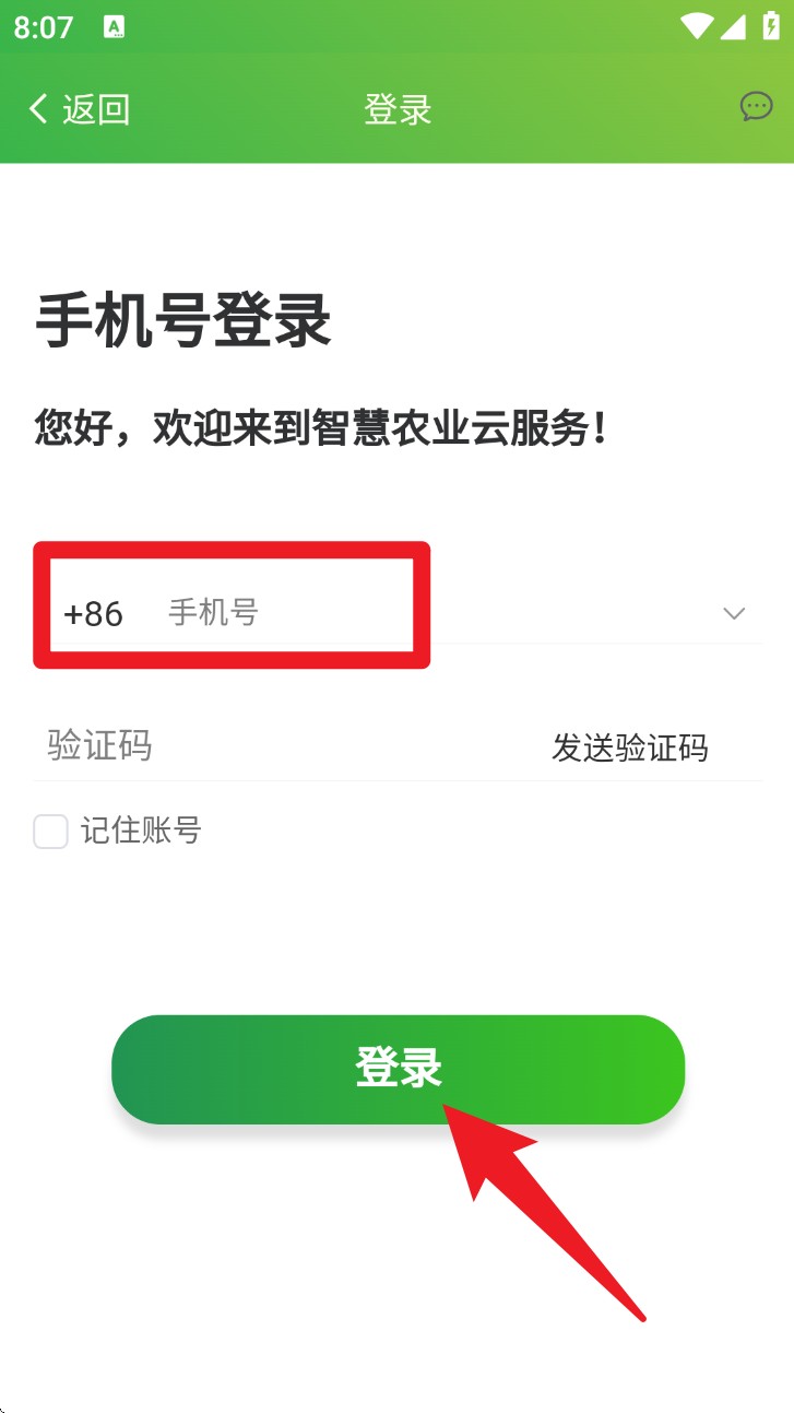 1. 打开 App 后输入手机号与验证码,点击绿色“登录”按钮即可进入系统首页。